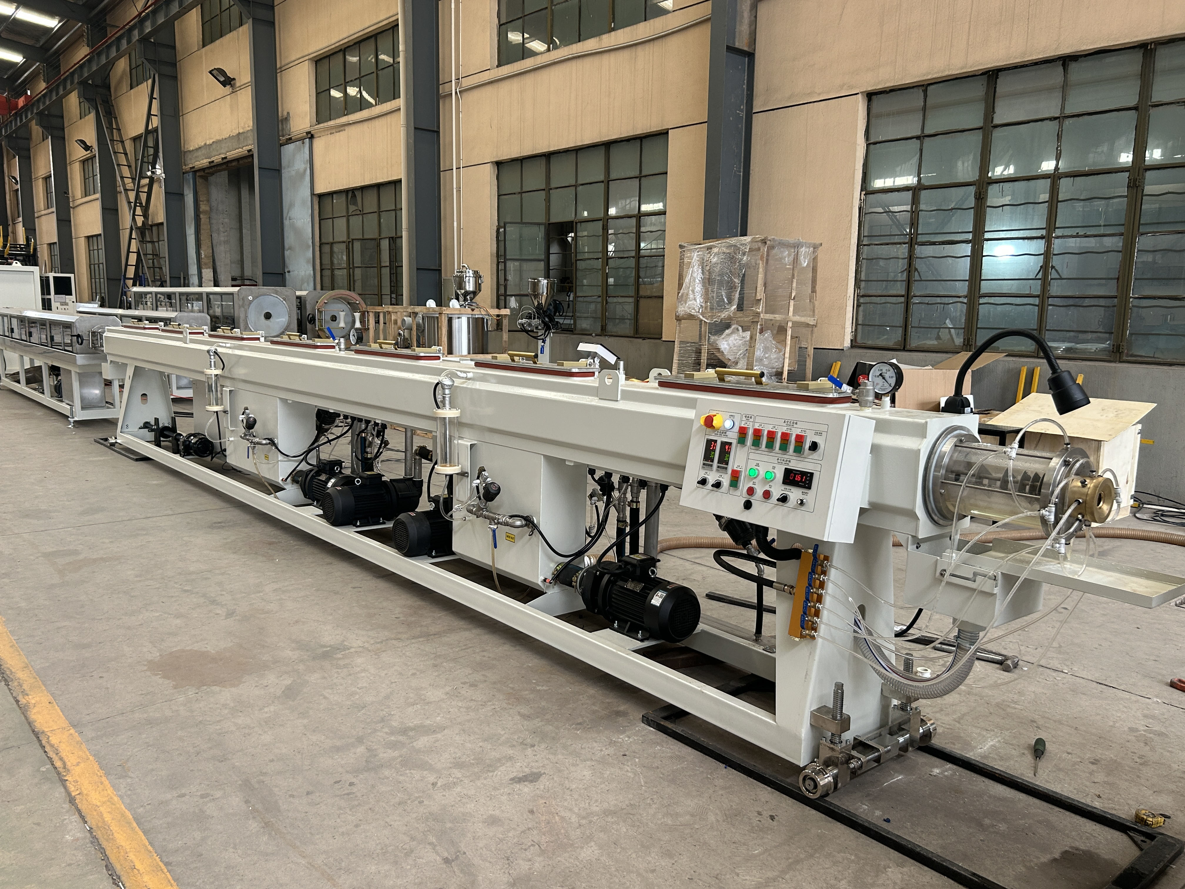 Эта полностью автоматизированная экструзионная линия обеспечивает высокую производительность, минимальные отходы и превосходное качество продукции для промышленности пластиковых труб и строительных материалов.