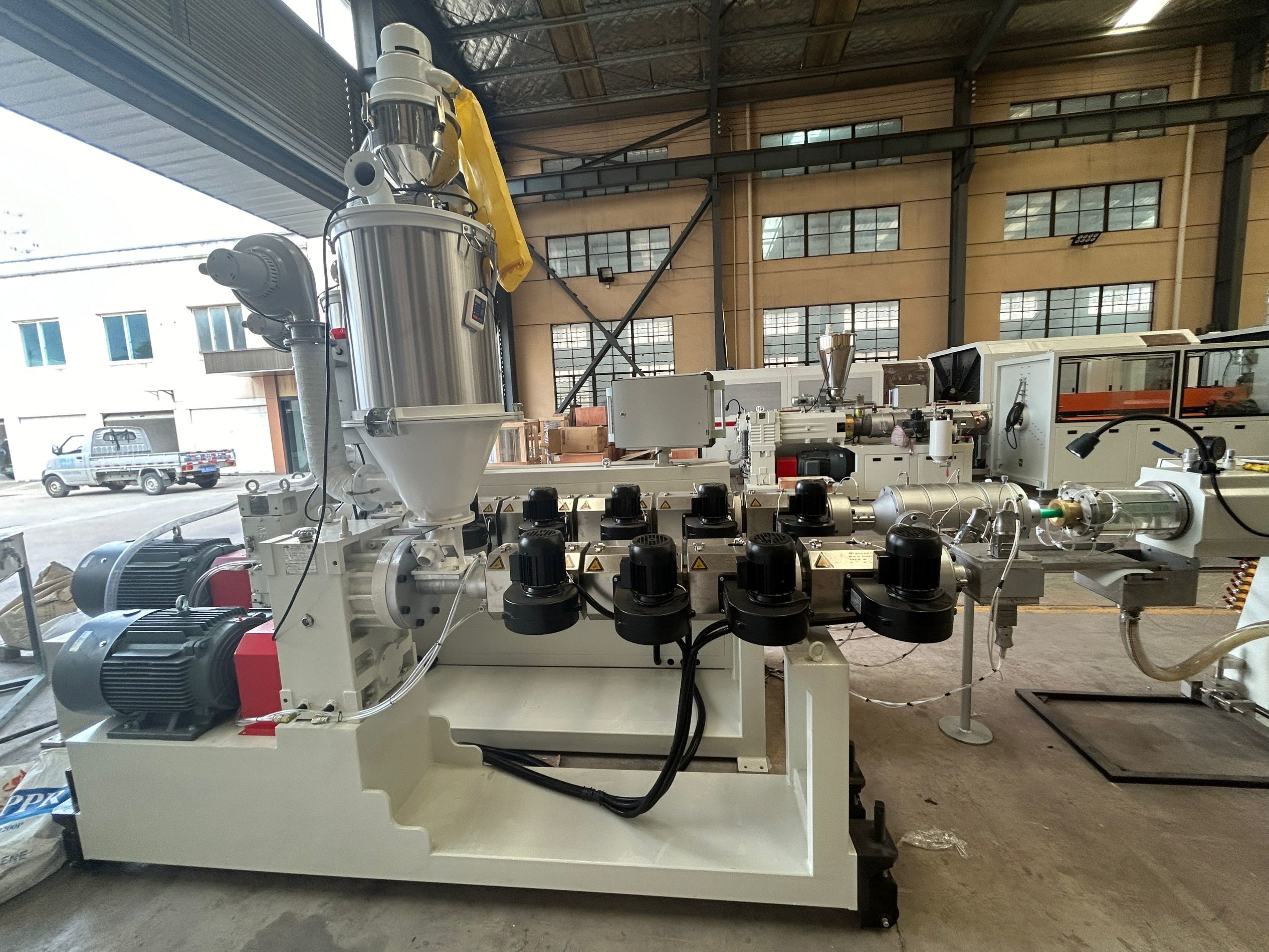 Сырье (пеллеты ППР/ПВХ, добавки) автоматически подается в погрузчик и смешивается равномерно.