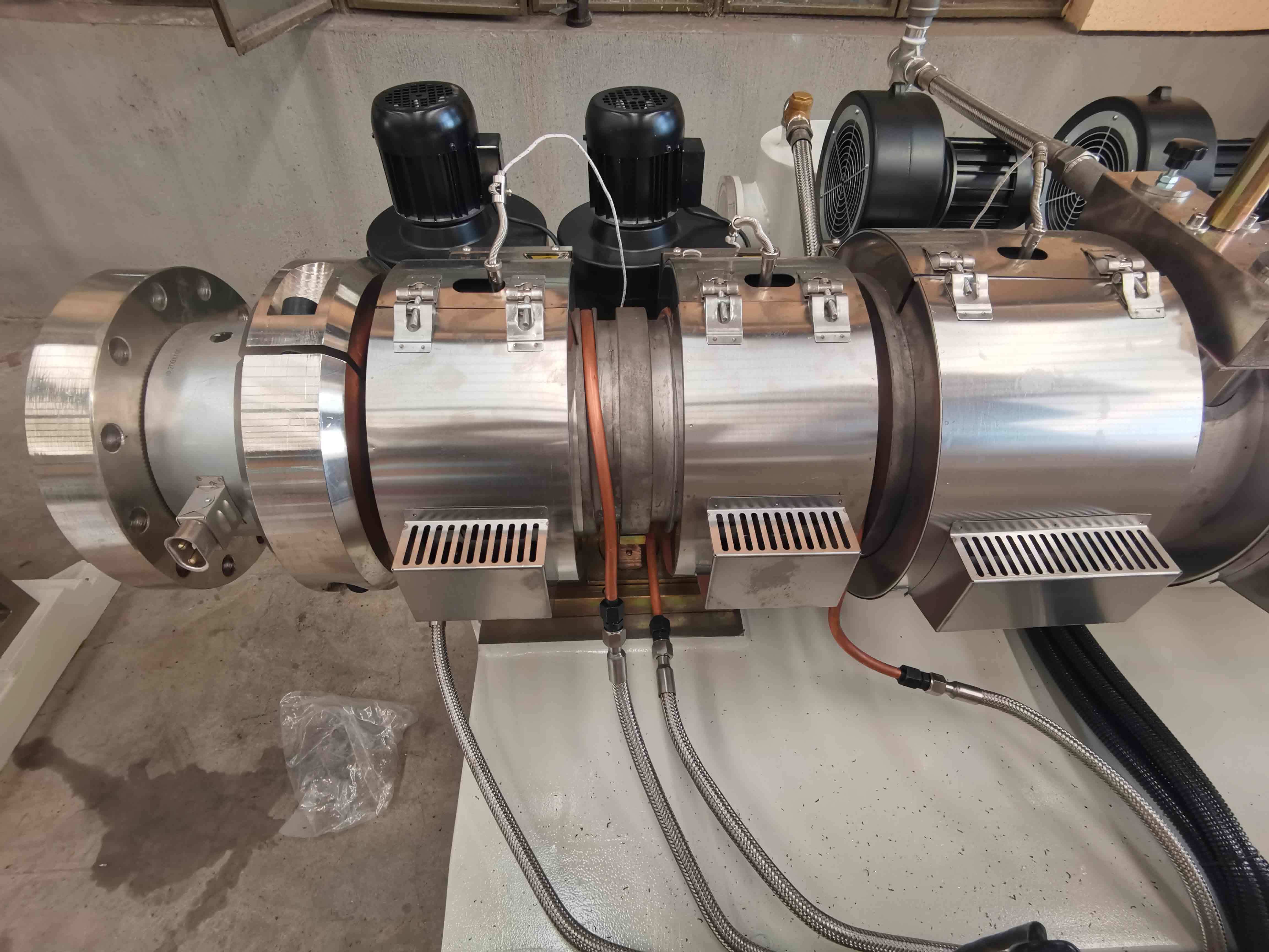 Эта линия по производству шлангов состоит из экструдера, водяного желоба, устройства отвода ленты, машины для плетения нитей и устройства намотки шланга и т. д. Линия экструзии шлангов из ПВХ обладает характеристиками разумного соответствия, уникальной структуры, надежной производительности, простоты эксплуатации, простоты обслуживания и непрерывной производительности. Шнек и цилиндр экструдера изготовлены из азотированной легированной стали. Система водяного охлаждения с рубашкой находится в зоне подачи, и все зоны цилиндра охлаждаются воздушным вентилятором. На цилиндре установлены нагреватели.