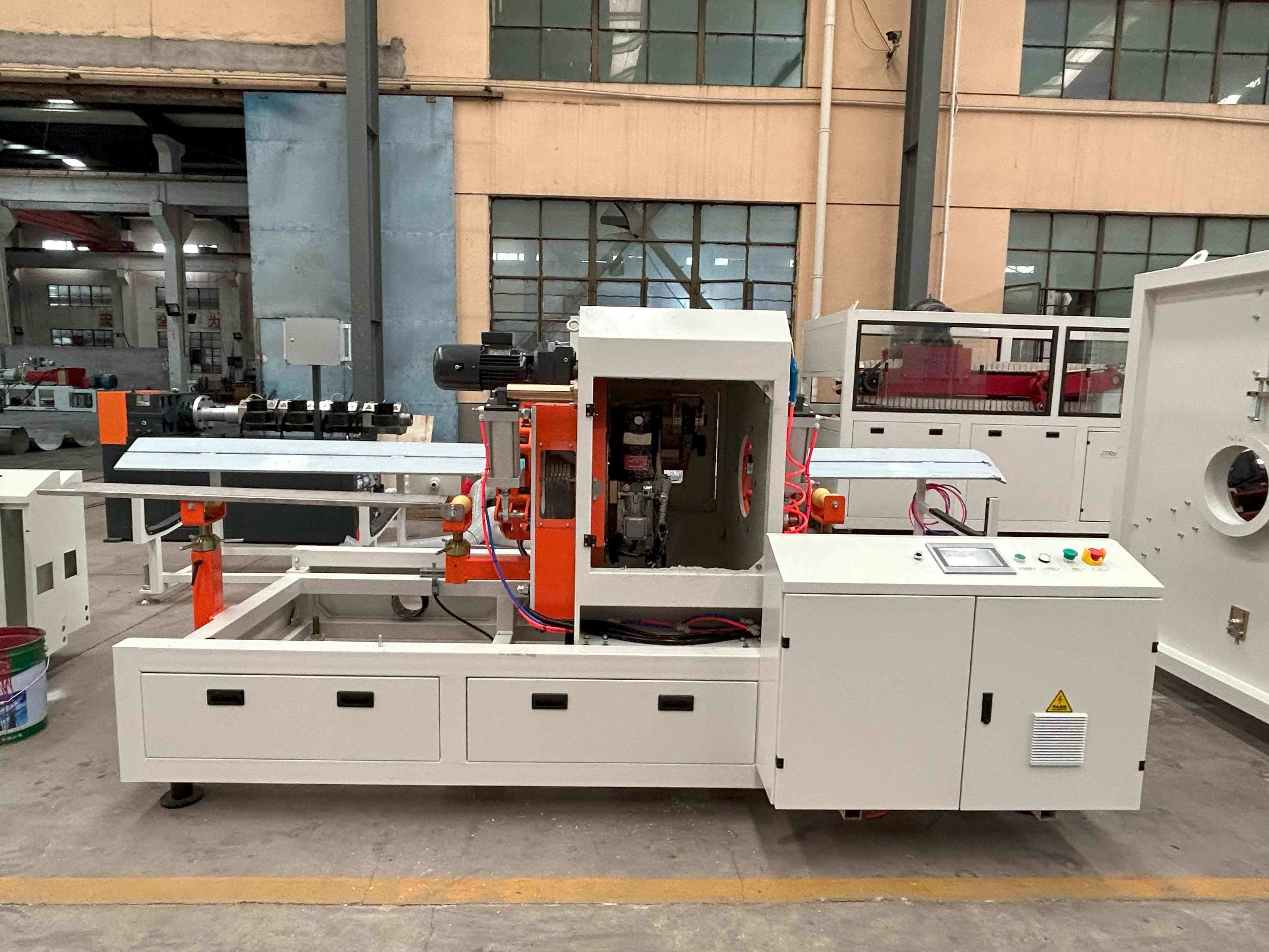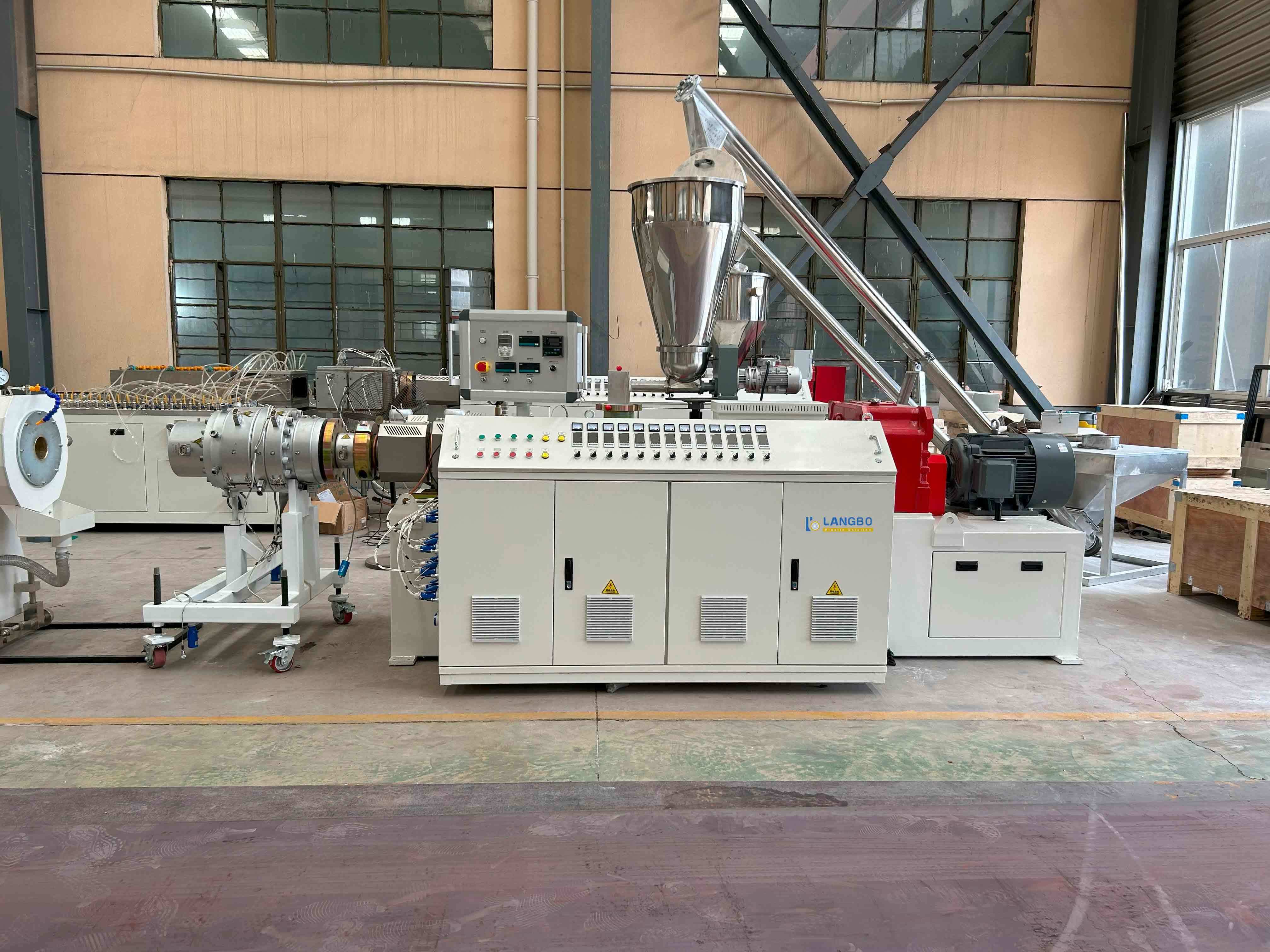 Загрузчик шнека для смесителя → Смесительный блок → Загрузчик шнека для экструдера → Конический двухшнековый экструдер → Матрица → Вакуумный калибровочный бак → Четырехзахватный отвод → Планетарный пильный станок → Раструбная машина / Стол для опрокидывания → Окончательная проверка и упаковка продукта