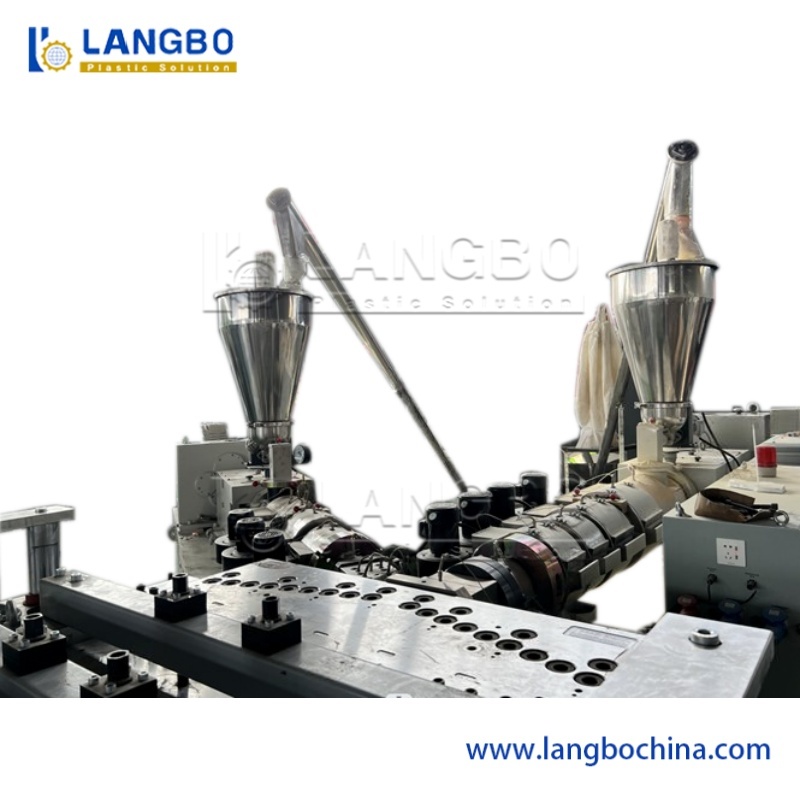 ПВХ-порошок + добавки → Смешивание → Всплеск → Экструдер с двумя винтами → Форма и калибровочный прибор → Вакуумная машина → Машина для вытягивания → Машина для резки → Складка.